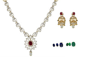 22K Gold Necklace & Earring set beautifully designed with detailed filigree work in combination with studded Kundans and colored stones with fine antique finish.