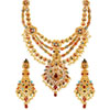 22K Gold Necklace & Earring set beautifully designed with detailed filigree work in combination with studded Kundans and colored stones with fine antique finish.